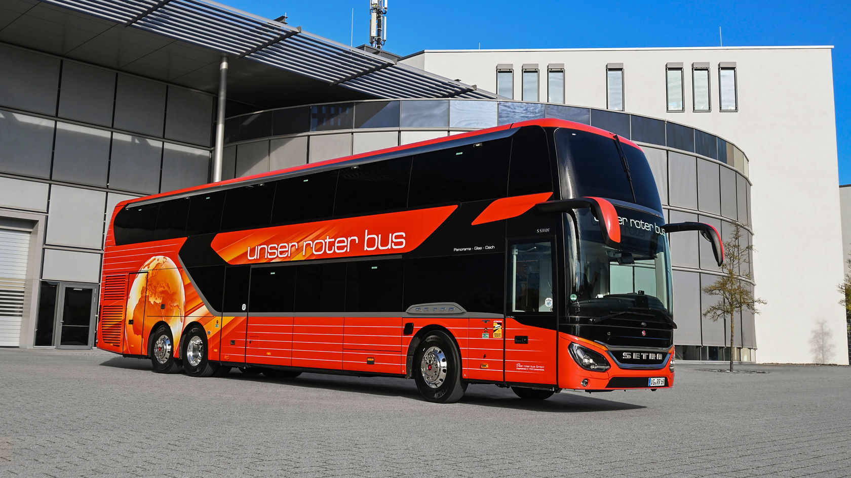 Das Reiseunternehmen „Unser Roter Bus GmbH“ aus Ueckermünde in Mecklenburg-Vorpommern hat vor wenigen Wochen einen neuen Setra Doppelstockbus übernommen. Der S 531 DT zeichnet sich unter anderem durch eine raumgewinnende 2+1‑Bestuhlung im Oberdeck aus. Zudem befindet sich an jedem der 32 Ledersitze ein individuell steuerbares Monitorsystem mit einem breitgefächerten Video- und Audioangebot.