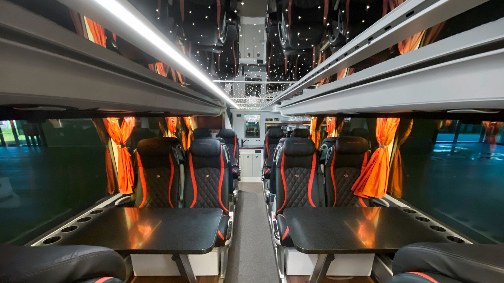 Im Unterdeck des Dreiachsers können es sich bis zu 16 Reisegäste in einem Bistrobereich ebenfalls auf Sitzen mit Ledergarnitur bequem machen – unter einem illuminierten Sternenhimmel.